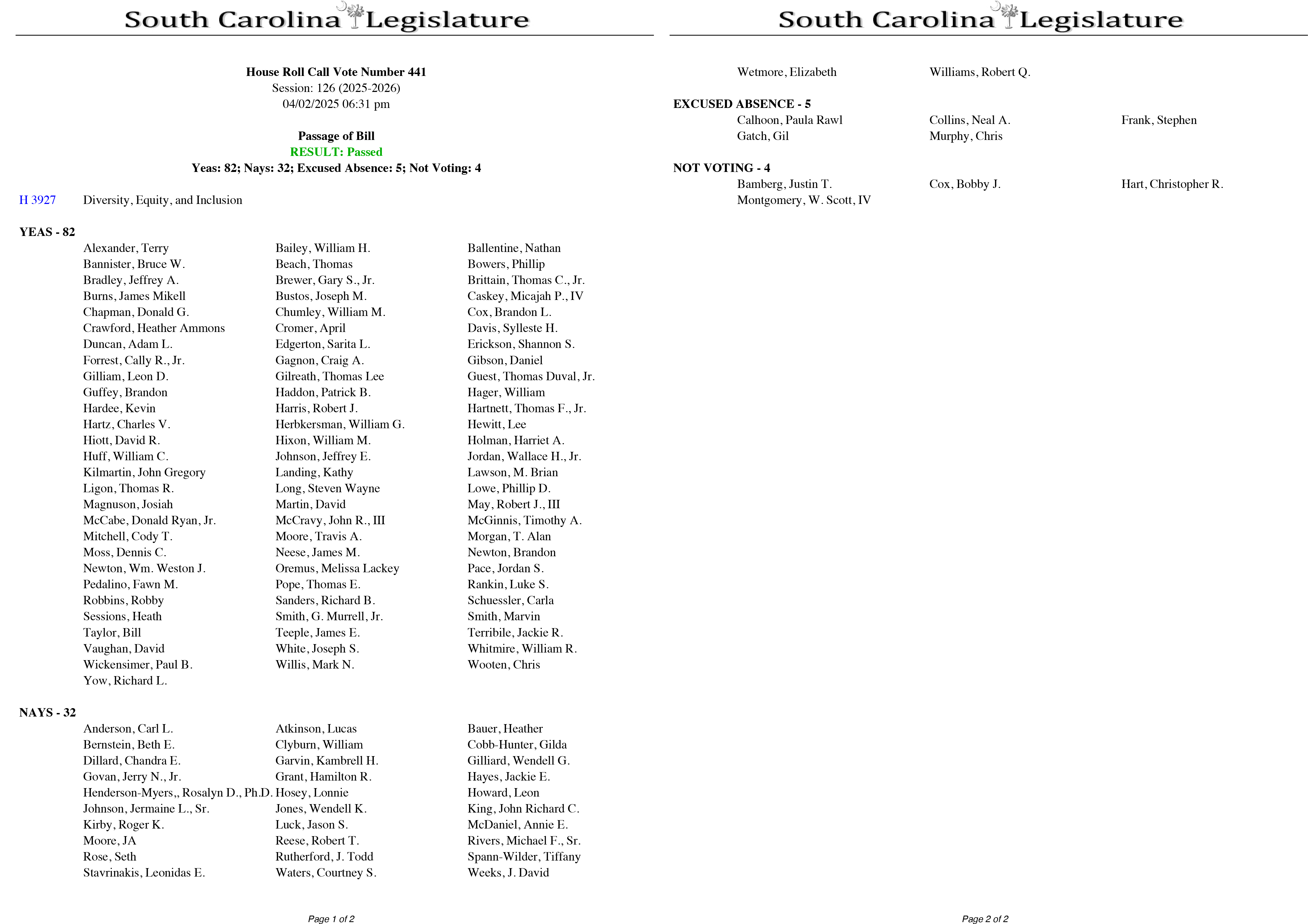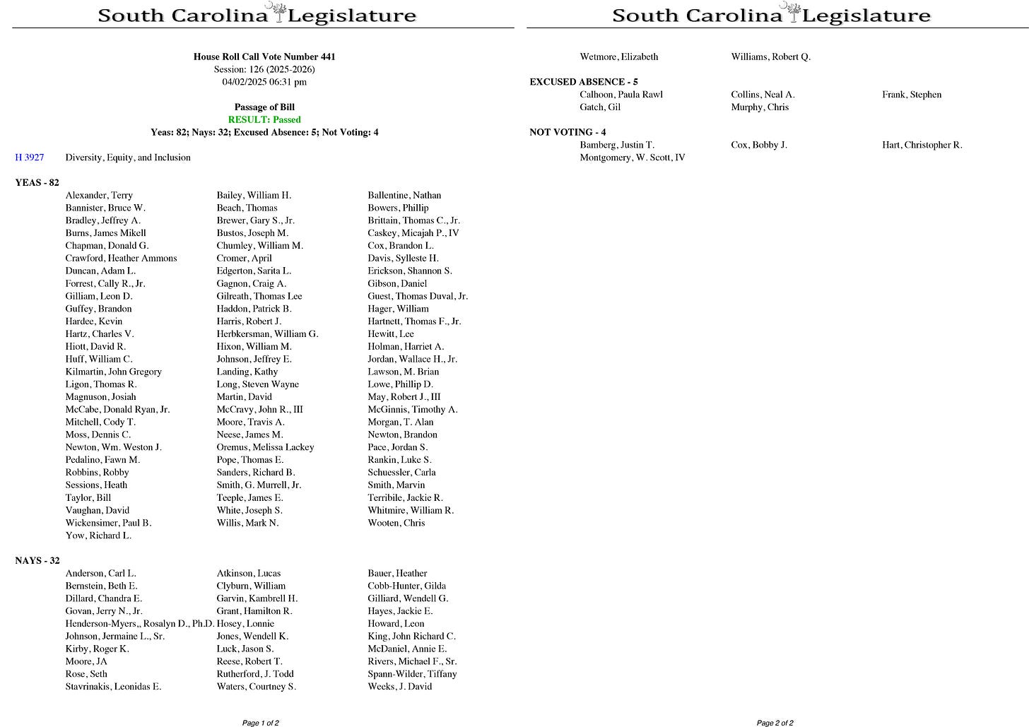 As of today, April 2, 2025, the South Carolina House of Representatives passed H. 3927 with an 82-32 vote. The bill recently passed the House Education and Public Works Committee with an amendment on March 20, 2025. The bill still needs to pass the state senate to head to Gov. Henry McMaster's desk.